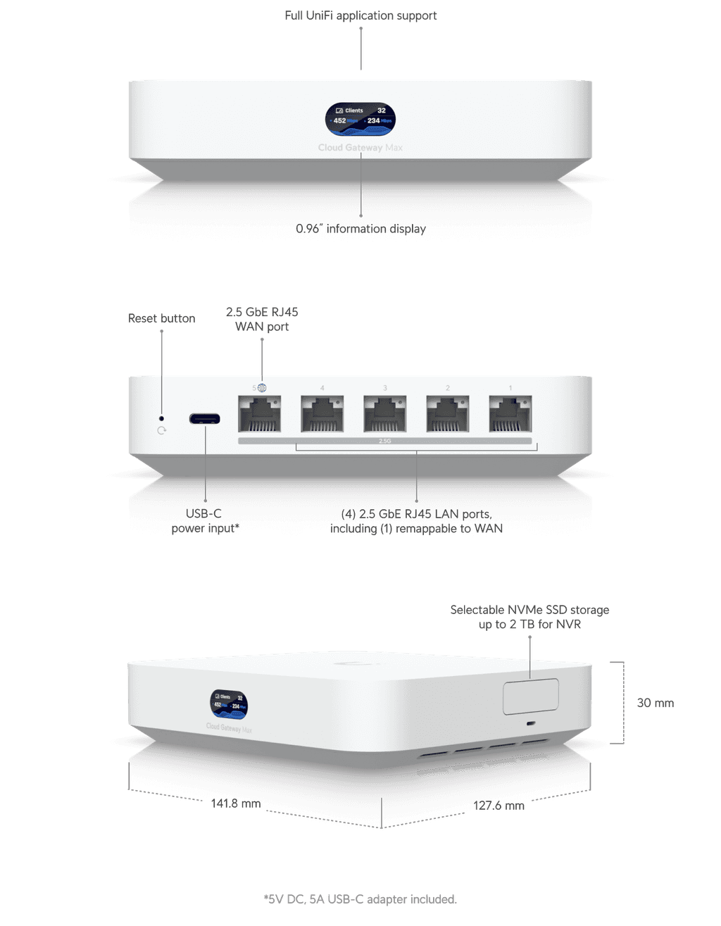 Ubiquiti Cloud Gateway Max SKU: UCG-Max Tech Specs: Click Here Installation Guide: Click Here Description: Compact 2.5G Cloud Gateway with 30+ UniFi device / 300+ client support, 1.5 Gbps IPS routing, and selectable NVR storage. Features: •Includes full UniFi application suite for device management •Manages 30+ UniFi devices and 300+ clients •1.5 Gbps routing with IDS/IPS •Multi-WAN load balancing •512 GB NVMe SSD storage for NVR •0.96' LCM status display •USB-C powered (adapter included) • Includes 2 Year Warranty - As part of the current promotion running from March to June 2024, all Ubiquiti items purchased during this period will come with a standard 2-year extended warranty.